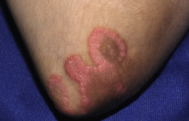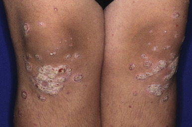 Classic lesions of psoriasis consist of round, brightly erythematous, well-marginated plaques covered by a characteristic grayish or silvery-white (mica-like, or “micaceous”) scale. Psoriatic papules coalesce to form plaques that measure 1 cm or more in diameter ( Figs. 4-1, 4-2, and 4-3 ). The disorder may present as solitary lesions or countless plaques in a generalized distribution. Lesions are usually bilaterally symmetrical with a distinct predilection for the scalp, elbows, knees, and lumbosacral and anogenital regions. However, lesions may also be found in a flexural distribution with involvement of the axillae, groin, perineum, central chest, and umbilical region. This variant, termed inverse psoriasis ( Figs. 4-4 and 4-5 ), may be seen without any extensor surface involvement in 2.8% to 6.0% of patients or in association with only regional involvement in 30% of patients. Lesions may also be limited to the palms ( Fig. 4-6 ) and soles ( Fig. 4-7, A ). A peripheral white ring is often the first sign of involution (termed a Woronoff ring ). However, when the central portions of the plaques resolve, the involuting lesions may appear nummular (small circles), annular (central clearing) ( Fig. 4-7, B ), gyrate, or arcuate (semicircular). A linear variant that courses along the Blaschko lines has also been described and may be associated with psoriatic arthritis.