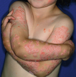 Pustular psoriasis and erythrodermic (exfoliative) psoriasis are the most severe variants of childhood psoriasis but occur in only approximately 1% of pediatric patients with the disease. Pustular psoriasis has been described as early as the first week of life. It usually occurs as generalized pustular psoriasis, but can be limited to the palms and soles (pustulosis palmaris et plantaris) or to fold areas.