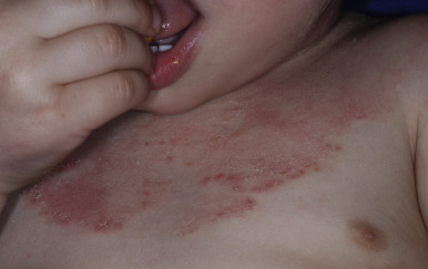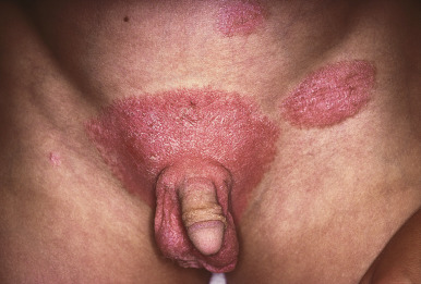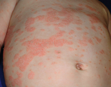 Psoriatic diaper rash (see Fig. 2-27 ) with or without dissemination is the presenting manifestation in 13% and 4% of patients, respectively. This form of psoriasis must be differentiated from infantile seborrheic dermatitis (see Chapter 3 ) and, when localized to the diaper area, other forms of diaper dermatitis (see Chapter 2 ). The sharply defined plaques, bright-red coloration, shininess, and larger, drier scales of psoriasis help to differentiate it from seborrheic dermatitis. Many infants with diaper-area psoriasis also show psoriasiform lesions elsewhere ( Fig. 4-18 ). Because of the increased moisture of the occluded diaper region, scale may not be visible clinically but can be revealed by scraping the area gently. The incidence of psoriasis in the diaper area during infancy probably reflects the Koebner phenomenon, triggered by trauma from exposure to stool and urine, and resolves when toilet trained. Nevertheless, boys and girls out of diapers may also show genital area involvement. Of prepubertal girls with a genital region complaint, 17% had psoriasis particularly involving the vulva, perineum, and natal cleft.