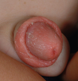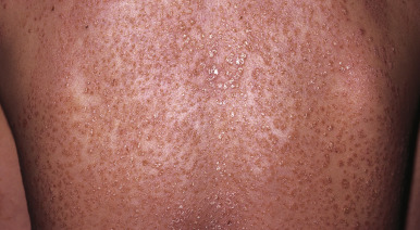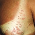 Pustular psoriasis with its onset during infancy may be localized to the neck fold. The disorder is often misdiagnosed as dermatitis caused by bacterial or candidal infection ( Fig. 4-24 ). Biopsy facilitates making the diagnosis, particularly given that many lesions clinically appear more papular than pustular. Other fold areas may be affected, and dissemination to generalized pustular psoriasis is not uncommon.