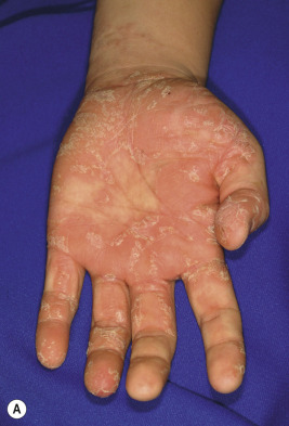 Just as psoriatic arthritis can develop in children with psoriasis who are administered a TNF inhibitor, children taking biologic agents for indications other than psoriasis can develop psoriasis or psoriasiform dermatitis. Occurring most often in children treated for Crohn disease, this seemingly paradoxical inflammatory cutaneous response has also been described in children with juvenile idiopathic arthritis, hidradenitis suppurativa, or Behçet syndrome. The psoriasis from TNF inhibitors favors the scalp, periorificial skin, nails, dorsal aspect of hands and feet ( Fig. 4-25 ), and often the palms and soles, where it can be pustular. Lesions are not uncommonly secondarily infected with S. aureus . The eruptions are described after a wide range of duration of treatment, ranging from one dose to up to 63 months. Its occurrence in no way affects the response to the biologic agent for the original indication, and the risk of occurrence is not reduced by concurrent administration of methotrexate. The mechanism for the development of psoriasis despite suppression by TNF inhibition remains unclear. Cytokine imbalance with increased expression of IFN, known to increase risk of psoriasis in chronic active hepatitis, has been proposed. Patients with Crohn disease who developed psoriasis on infliximab were more likely to have homozygous IL-23R polymorphisms, suggesting a genetic tendency. An infectious trigger, particularly streptococcal or staphylococcal infection, has been suggested as well.