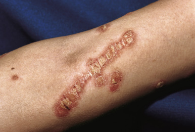 The hallmark of psoriasis is the micaceous scale that is generally attached at the center rather than the periphery of lesions. Removal of this scale results in fine punctate bleeding points. This phenomenon (termed the Auspitz sign ) is highly characteristic and relates to rupture of capillaries high in the papillary dermis of lesions. The Koebner phenomenon (an isomorphic response) is commonly seen in psoriasis ( Fig. 4-8 ) but also in verrucae, Rhus dermatitis, lichen planus, lichen nitidus, Darier disease, and PRP. This valuable diagnostic sign of psoriasis describes the occurrence of skin lesions at sites of local injury such as after irritation (a scratch or sunburn) ( Fig. 4-9 ), a surgical scar, or a preexisting disease such as seborrheic or atopic dermatitis. The Koebner phenomenon likely is responsible for psoriasis of the diaper region and around enteral feeding tubes.