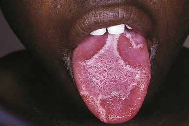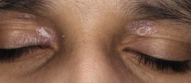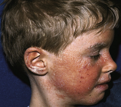 Facial psoriasis is more common in children than in adults and occurs without other involvement in 4% to 5% of patients. Involvement of the periorbital area is most typical ( Fig. 4-10 ), and lesions may be subtle, leading to confusion with atopic dermatitis ( Fig. 4-11 ). The plaques of psoriasis tend to be more clearly delineated than patches of atopic dermatitis, are less pruritic, and may show an annular configuration. It should be noted, however, that approximately 5% of pediatric patients show an eczema/psoriasis overlap, either showing typical lesions of both atopic dermatitis and psoriasis or lesions that are intermediate (e.g., nummular and psoriasiform). Almost all patients with the overlap have a family history of both atopic disease and psoriasis. Although mucosae do not tend to be affected in psoriasis, geographic tongue is an often unrecognized feature of psoriasis in many children ( Fig. 4-12 ).