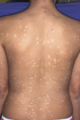 Seen in up to 44% of pediatric patients, guttate psoriasis generally occurs in children and young adults and is often the first manifestation of psoriasis. Lesions are drop-like (guttate), round or oval, measure from 2 mm to 6 mm in diameter ( Figs. 4-13 and 4-14 ), and generally occur in a symmetrical distribution over the trunk and proximal aspects of the extremities (occasionally the face, scalp, ears, and distal aspects of the extremities). Guttate psoriasis is often, but not necessarily, triggered by group A streptococcal infection of the oropharynx or perianal area. Two-thirds of patients with guttate psoriasis give a history of an upper respiratory tract infection 1 to 3 weeks before the onset of an acute flare of the disorder. Although guttate psoriasis may clear spontaneously ( Fig. 4-15 ), 40% of affected children progress to the plaque type, which may ultimately be more severe psoriasis than in children with plaque disease initially.