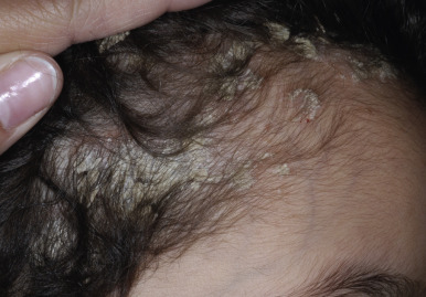 The scalp is commonly the initial site of psoriatic involvement (20% to 40%), and scalp psoriasis occurs more often in affected girls than boys, perhaps because the Koebner phenomenon associated with combing, brushing, and vigorous shampooing. Most typical are well-demarcated erythematous plaques with thick, adherent silvery scales similar in appearance to those on other parts of the body ( Fig. 4-16 ). However, psoriatic lesions of the scalp, eyebrows, and ears (the superior and postauricular folds and external auditory meatus) may instead be greasy and more salmon-colored, suggesting a diagnosis of seborrheic dermatitis. In this variant, often termed sebopsoriasis , lesions may present with features of both seborrhea and psoriasis. Whereas lesions of seborrheic dermatitis generally remain within the hairline, lesions of psoriasis often extend beyond the confines of the hairline onto the forehead (see Fig. 4-3 ), preauricular, postauricular, and nuchal regions. Rapid response to therapy further distinguishes seborrhea from psoriasis. Another scaling disorder of the scalp that may be a variant of psoriasis is pityriasis amiantacea (asbestos-like) ( Fig. 4-17 ) ; the alternative term, tinea amiantacea , should be abandoned, because the disorder is unrelated to dermatophyte infection. The disorder more commonly occurs in pediatric patients without other signs of psoriasis and is characterized by large plates of scale firmly adherent to the hair and scalp. Focal hair loss and secondary infection may be associated. Pityriasis amiantacea usually begins in school-aged children and adolescents and progresses to more typical psoriasis in 2% to 15% of pediatric patients. Pretreatment of affected scalp areas with fluocinolone 0.01% oil daily and then shampooing with a keratolytic shampoo is usually effective.