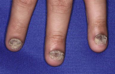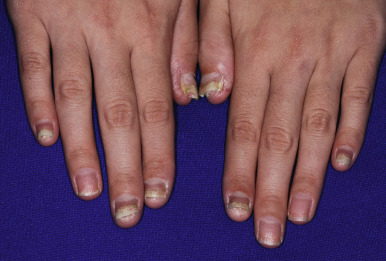 Psoriatic nails are extremely distressing to the patient, respond slowly to therapy, and are difficult to treat topically because of the failure of topical agents to penetrate the nail plate. Instillation of class-I steroid solutions into the subproximal nailfold area can be successful, especially applied under occlusive tape at night, but application nightly of flurandrenolide-impregnated tape (Cordran) to the base of the nail for approximately 6 months tends to yield better results. Injections of triamcinolone suspension (10 mg/mL) into the nailfold of the abnormal nail with a 30-gauge needle every 4 to 6 weeks is painful, even with the use of topical anesthetic creams and should be reserved for the motivated older child or adolescent who fails to respond to topical application. Nightly application of tazarotene 0.05% or 0.1% gel under occlusion, if tolerated, has been shown to cause improvement. Use of topical indigo naturalis oil extract has recently been described. Disfiguring nail psoriasis that is unresponsive to topical measures may respond to systemic intervention (generally methotrexate or a biologic medication), but the decision to start a systemic medication must be carefully weighed.