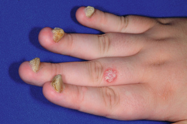 Although statistics vary, the nails appear to be affected in 25% to 50% of pediatric patients with psoriasis, more commonly during the second decade of life and in males ( Figs. 4-19, 4-20, and 4-21 ). Pitting is most characteristic, manifesting as small, irregularly spaced depressions measuring less than 1 mm in diameter. Larger depressions or punched-out areas of the nail plate may also be noted. These pits are thought to represent small intermittent psoriatic lesions in the nail matrix region that forms the superficial layers of the nail plate. Psoriatic pitting may be indistinguishable from nail pitting seen in alopecia areata (see Chapter 7 ) and atopic dermatitis (see Chapter 3 ), although other features assist in differentiating these disorders. Discoloration, onycholysis (separation of the distal and lateral nail plate edges), and subungual hyperkeratosis (lifting of the nail plate with nail thickening) (see Fig. 4-21 ) are also commonly seen. Secondary bacterial, candidal, and occasionally dermatophyte infections occur with increased incidence.