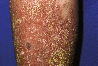 On previously quiescent psoriatic plaques or normal skin, erythematous halos develop and rapidly become studded with superficial pinpoint-sized up to 2- or 3-mm pustules ( Fig. 4-22 ). The lesions of generalized pustular psoriasis in children show an annular morphology in 60% of patients ( Fig. 4-23 ). Sheets of erythema and pustulation can involve the flexures, genital regions, webs of the fingers, and periungual areas. The cutaneous inflammation typically progresses in an explosive manner from discrete sterile pustules to crusts and ultimately to generalized exfoliative dermatitis. More than 90% of the skin shows intense erythema, massive exfoliation, and associated abnormalities of temperature and cardiovascular regulation. The nails often become thickened or separated by subungual lakes of pus. Mucous membrane lesions in the mouth and tongue are not uncommon. Fever, malaise, and anorexia are typically associated with generalized pustular psoriasis. Affected children may show failure to thrive. Patients with extensive pustular or erythrodermic psoriasis usually require hospitalization, and courses are not uncommonly complicated by cutaneous infection and bacterial septicemia. The disease is cyclic and associated with complete clearance of the pustular phase and unexplained exacerbations that span decades. Relapses are common and become progressively more severe, often with a poor prognosis. In contrast to the occurrence of pustular psoriasis in adults known to have psoriasis, pustular psoriasis is often the first manifestation of psoriasis in affected infants and children. The predominant histologic feature on biopsy is the large intraepidermal unilocular pustule containing polymorphonuclear leukocytes (the spongiform pustules of Kogoj) with little if any surrounding spongiosis or inflammation. Although staphylococcal infection may at times occur as a secondary complication, lesions are usually sterile.