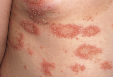 Guttate psoriasis and plaque psoriasis are most commonly confused with dermatitis as well as other papulosquamous disorders described in this chapter, especially pityriasis rosea or pityriasis lichenoides chronica (PLC) ( Box 4-1 ). PRP is the hardest to differentiate, especially when involved areas are largely the palms, soles, elbows, and knees. The follicular accentuation, focal areas of sparing, and sometimes more salmon coloration of PRP can help to distinguish the conditions clinically; biopsy sections of PRP may show perifollicular inflammation. A plaque-type psoriasiform eruption and less often a generalized or annular pustular psoriatic eruption may follow Kawasaki disease (see Chapter 21 ). Generalized and localized forms of pustular psoriasis can be differentiated from infectious causes of pustulosis by cultures and from noninfectious conditions such as eosinophilic folliculitis or infantile acropustulosis by biopsy. Psoriasiform dermatitis may also be seen in boys with immune dysregulation, polyendocrinopathy, enteropathy, or X-linked (IPEX) syndrome (see Chapter 3 ). Atypical cases of psoriatic arthritis must be differentiated from other types of juvenile idiopathic arthritis or systemic lupus erythematosus.