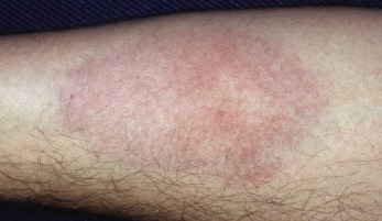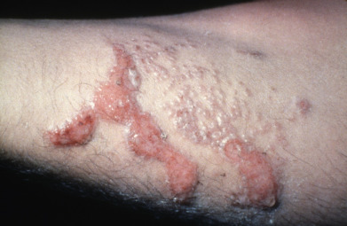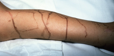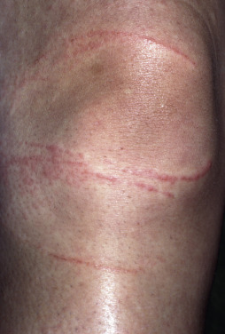 Cutaneous larva migrans demonstrates an erythematous serpiginous lesion. The worm is located ahead of the advancing border of the lesion, as the cutaneous reaction is a manifestation of a delayed-type immune response to the organism.