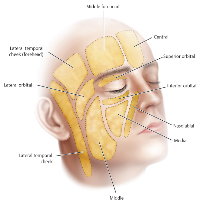 • Midface: Nasolabial, medial cheek, middle cheek, lateral temporal-cheek (same as above).
