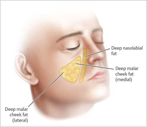 • Three key fat compartments that influence midface volume loss are the nasolabial, deep medial, and deep lateral fat compartments. The deep midfacial fat compartment is medial to the zygomaticus major muscle (Fig. 5.2).