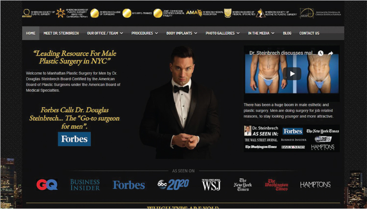 X Factor Media was approached by Dr. Douglas S. Steinbrech in late 2013 with a new initiative. He wanted to roll out a website dedicated to male aesthetic surgery. At the time, we were a bit skeptical. Our research showed that men only constituted for roughly 9% of all aesthetic procedures in 2012. We were tasked with creating a website or an online resource (more or less). Male Plastic Surgery New York was born (www.MalePlasticSurgeryNewYork.com) ( Fig. 1.1 ).