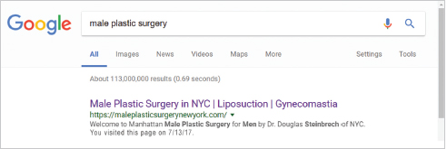 According to ASAPS, an increasing number of men are undergoing aesthetic surgery. Between 1997 and 2012, there was a 106% increase in male aesthetic surgery. The most popular procedures showcase the areas that men are most interested in improving, as well as offer helpful guidance to men considering getting some work done.4 When we launched Male Plastic Surgery New York, we were well equipped to catch the wave. Not only could the website drive business, but it also could become an online resource for any man researching aesthetic procedures. At this point, it was the right content, at the right place, at the right time. We doubled down on an organic program to earn favorable ranks in Google without having to rely on pay-per-click (PPC), which can be an expensive proposition over the long run.