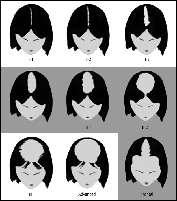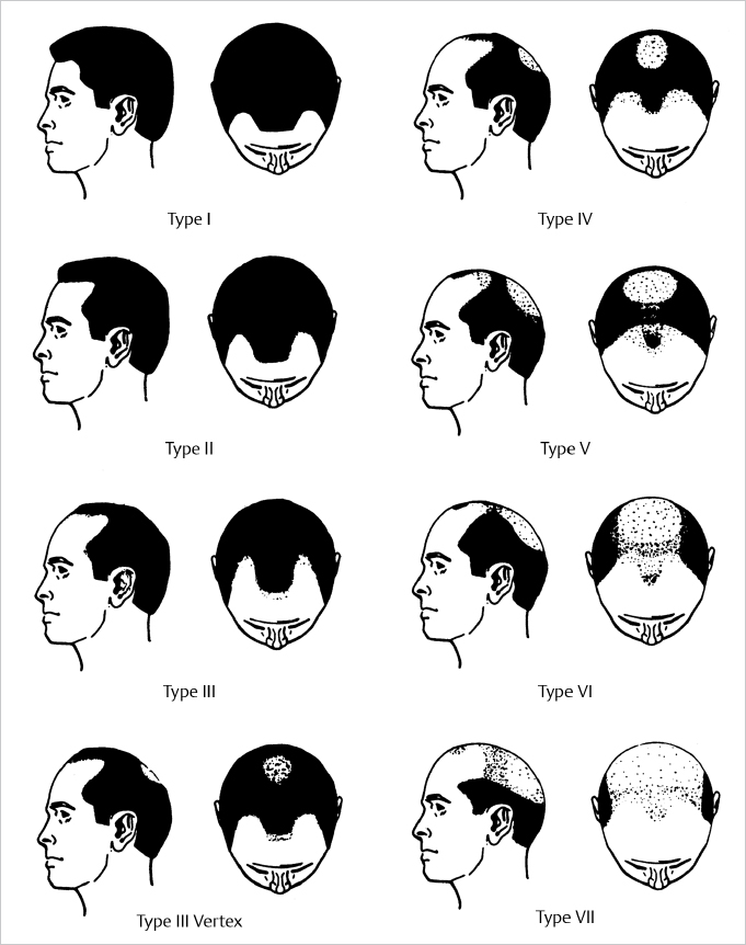 Male pattern baldness begins with a receding hairline and a thinning of the crown. Female pattern hair loss typically begins at the midline of the central scalp and outward. The hairline is usually retained ( Fig. 21.1 , Fig. 21.2 ).