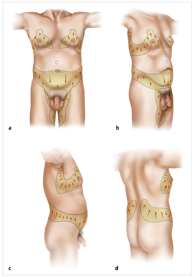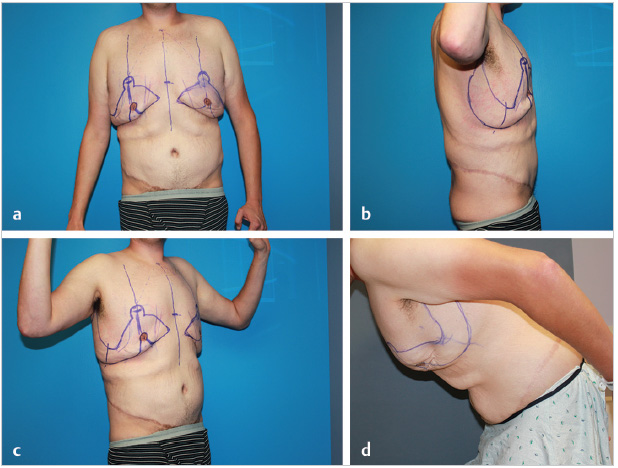 After massive weight loss (MWL), men seek body contouring surgery for the removal of excess skin and fat followed by tightening and suspension of residual lax tissues through taut closure of excision sites. Most men have at least correction of pseudogynecomastia and an abdominoplasty with posterior extensions. 1 Muscular men desire correction of gynecomastia followed by upper body dominance and muscular show. This chapter presents original operations for moderately ptotic gynecomastia and upper torso skin laxity after MWL. 2 Chapter 40 addresses male total body lift, which is a collection of operations that include a boomerang pattern excision correction.