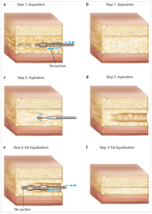 Only after separation of the targeted fat from its attachments is achieved, a more conventional cannula (e.g., a 2.7-, 3-, or 4-mm angled long-port double Mercedes wall cannula) with smaller, less aggressive, and more numerous ports is used to aspirate the now “emulsified” low-resistance fat. Because the fat has already been separated, this aspiration process is fast and almost entirely bloodless and can be accomplished with smaller, less aggressive cannulas that cause minimal trauma to the surrounding fat, vasculature, and stromal network left behind, which is necessary to provide a smooth, natural contour that will heal uneventfully. Step 2, aspiration, usually constitutes approximately 40% of the total treatment time.