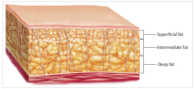 The anatomy of subcutaneous fat is traditionally divided into a superficial and deep compartment, separated by Scarpa’s fascia or the superficial fascial equivalent. The superficial adipose layer has dense, compact fat within tightly organized fibrous septa, while the deeper fatty layer is more loosely arranged and more areolar.5 Clinically, because liposuction is blind, it is more useful to manage the fat from the perspective of depth relative to the skin rather than with respect to Scarpa’s fascia. Although somewhat arbitrary and simplified, we divide the subcutaneous fat into three layers: superficial, intermediate, and deep 6 ( Fig. 25.2 ).