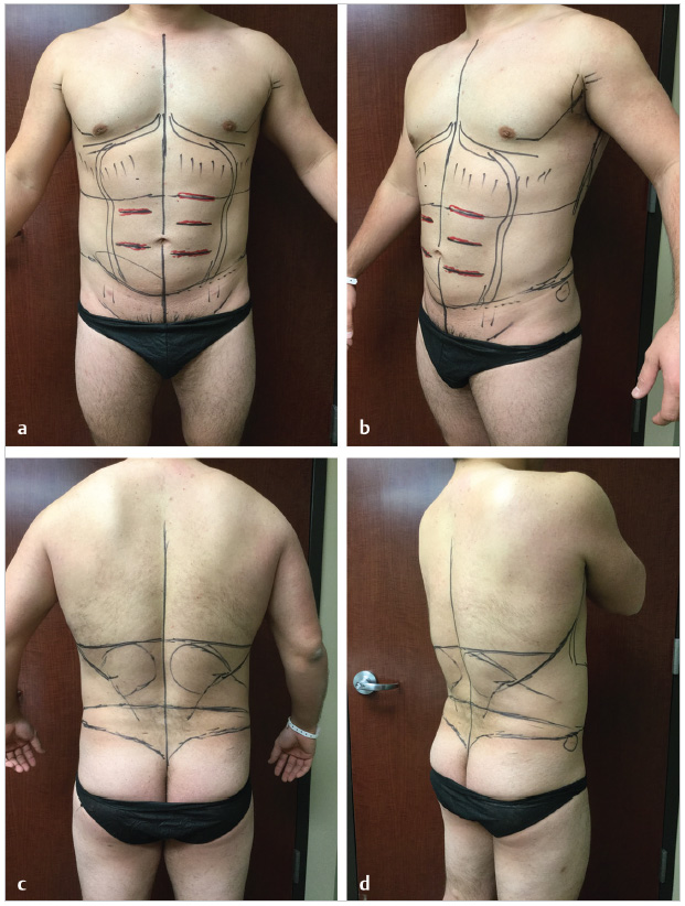 In patients with less subcutaneous fat and clearly visible underlying abdominal musculature, we will perform extra equalization at the linea semilunaris and the linea alba to give the abdomen a better three-dimensional shape, but we perform this technique cautiously and only in this subset of patients. We recommend against this technique in obese patients with a thicker subcutaneous fat compartment and no visible abdominal muscular anatomy. In general, the superficial compartment should not be treated with etching if the deeper compartments have significant residual lipodystrophy. Abdominal etching is particularly difficult to control postoperatively, given that the abdomen is one huge flexion crease. Postoperative contour control with foam, proper compression, avoidance of flexion, and avoidance of unfavorable compression from tight clothing are all crucial in achieving favorable results in abdominal etching.