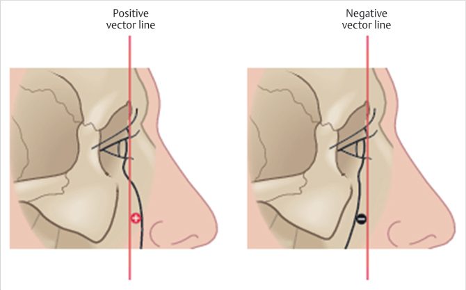 A negative vector is demonstrated when the malar eminence is posterior to the corneal surface of the globe.