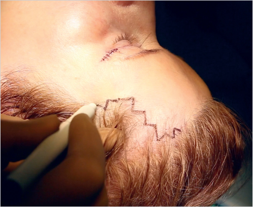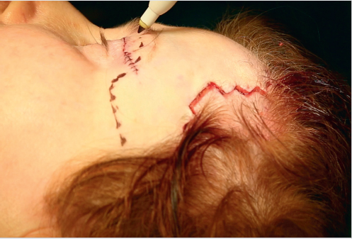 The procedure is performed via a zig-zag incision along the vertical portion of the temporal hairline. The technique requires excision of dog-ears along the transverse portion of the temporal hairline and along a portion of the frontal hairline (Fig. 37.1).