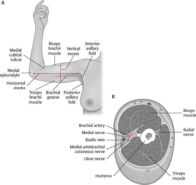 Fig. 58-1 Anatomy of the arm. A, External landmarks. B, Cross section.