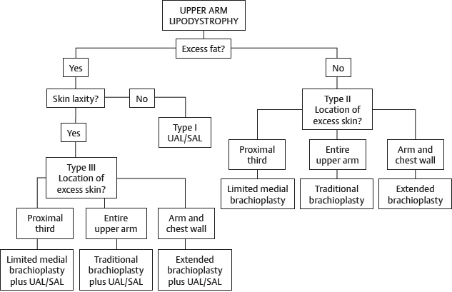 Fig. 58-2 Algorithm for treatment of upper arm lipodystrophy. (SAL, Suctionassisted liposuction; UAL, ultrasoundassisted liposuction.)