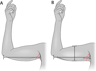 • If there is vertical and horizontal skin excess, add an L-shaped extension to the linear horizontal incision in the axilla (Fig. 58-4, B).