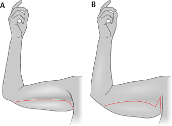 • Many place the scar within the brachial groove, whereas others prefer a posteriorly positioned scar.