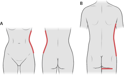 • Concavity below the rib cage that changes to a convexity over the hips and thighs