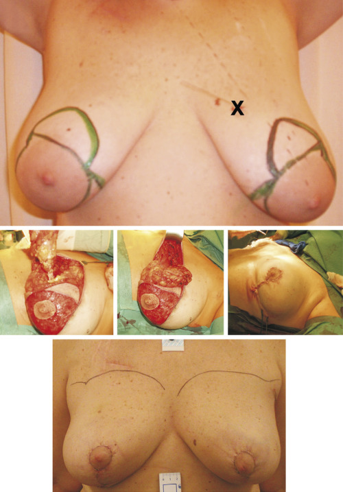 In patients with central/medial defects, the extended latissimus dorsi myocutaneous flap can be used. Conversely, if not enough breast tissue remains, the breast defect is classified as unfavorable and a skin-sparing mastectomy is indicated. In type IIIC defects, sometimes the defect is favorable and the deficiency is most frequently reconstructed with bilateral reduction mammaplasty. A marked reshaping of the breast with available tissue and a similar contralateral breast reduction is then performed ( Fig. 16.1 ).