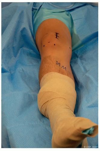 • Tourniquet can be placed as far proximally as possible. An inflated tourniquet may inhibit or alter normal tracking of the patella. Therefore, it is beneficial to do the examination under anesthesia (EUA) prior to utilizing the tourniquet. It may also be beneficial to hyperflex (>120°) the knee during tourniquet inflation to not capture the quadriceps. This can facilitate more normal patellar tracking during surgical correction