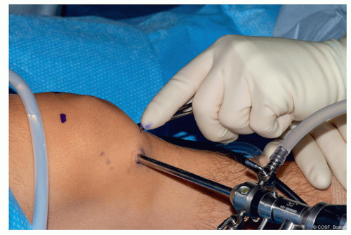 • Standard anteromedial and anterolateral portals. A superior (“high”) lateral portal can be utilized for assessment of the patellofemoral articulation (both in terms of diagnosis and also to assess tracking post intervention arthroscopically)