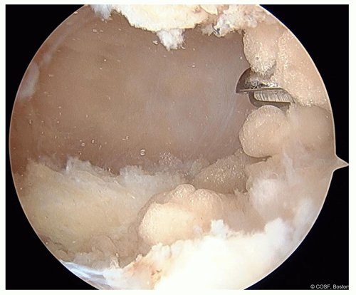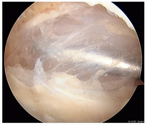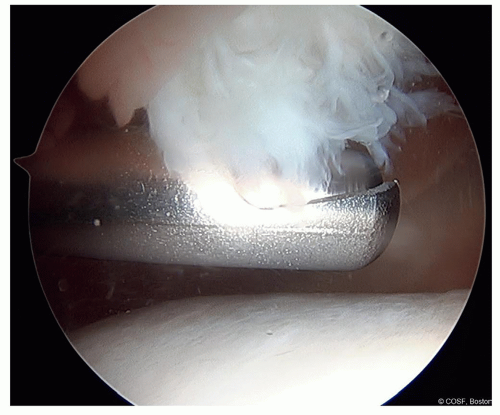 • Arthroscopically, this can be completed with a radiofrequency ablator or arthroscopic Bovie or alternatively involve passage of scissors through the anterolateral portal with hemostasis assistance after release (Figures 32.5 and 32.6)
