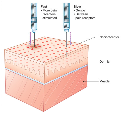 Topical anaesthesia makes little difference to the pain of intramuscular injections, unless highly concentrated (e.g. LMX) or in place long enough to penetrate. SLOW insertion of the needle makes a big difference to the perception of pain. The goal is to enter the skin without causing it to ‘dip’ and stimulate the pain receptors on either side ( Fig. 4.4 ). It helps to enter at a 90 degree angle to the surface because that is the smallest surface area stimulated. With practice, it is actually possible to ‘get lucky’, to enter in between the pain receptors with the patient feeling nothing.