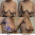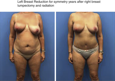 When deliberating over cancer treatment options, one concern patients often voice is the potential asymmetry after breast conservation surgery that can result in the removal of a significant fraction of total breast volume. In addition, breast asymmetry is compounded by the overall size reduction that occurs after whole breast irradiation. Whole breast radiotherapy after BCT can reduce the risk of local recurrence as much as threefold compared with surgery alone and, therefore, is a necessary component of breast conservation. Many patients after an initial satisfactory cosmetic result following breast conservation will develop a progressive asymmetry over time, prompting the need for additional surgery. This is usually a contralateral reduction mammaplasty ( Fig. 21.1 ). Therefore, symmetrization procedures done at the time of lumpectomy can be an important addition to BCT with the benefit of optimizing long-term cosmetic results and perhaps even discouraging unnecessary mastectomies. As a consequence of the advancements in oncoplastic surgery, especially among the west coast surgical oncology pioneers, oncoplastic procedures are becoming more accepted and utilized.