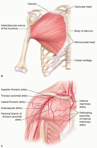 FIG 1 (Continued) • B. Origin and insertions of the pectoralis major. C. Vascular anatomy of blood supply to pectoralis major.