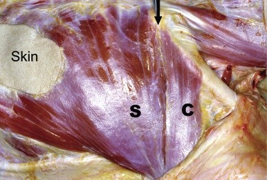 The pectoralis major muscle is a thick, fan-shaped muscle, situated on the upper chest that provides adduction and internal rotation of the arm ( Fig. 34.1 ). It has four sites of origin: first, the anterior surface of the medial half of the clavicle; second, the lateral half of the anterior surface of the manubrium and the sternum extending inferiorly to where the 6th or 7th costal cartilages are attached; third, the costal cartilage from the 2nd to the 6th rib; and fourth, the aponeurosis of the external oblique muscle. From this wide origin, the muscle fibers converge laterally toward the insertion. Those fibers arising from the clavicular portion pass obliquely downward and laterally and are separated from the sternocostal portion by a groove; the fibers from the sternocostal head pass laterally and upward ( Fig. 34.2 ). They join to form a 5 cm flat tendon, which is inserted into the crest of the greater tubercle of the humerus.