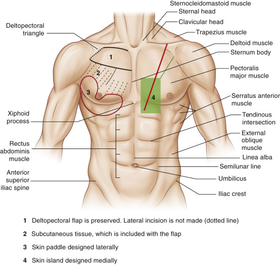 The pectoralis muscle can be harvested as a pedicled muscle flap or it can be harvested together with an intact skin island on the muscle as a pedicled myocutaneous flap. The latter is the most frequently used modality of the pectoralis flap. The muscle flap may also be harvested attaching to a segment of the costal cartilage or the lateral portion of the anterior cortex of the sternum. When a skin island is included, the former becomes the “costomyocutaneous flap” and the latter, “osteomyocutaneous flap.”