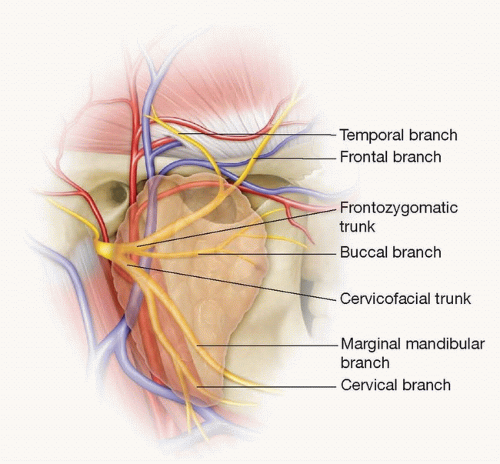 Five branches are classically described as exiting the parotid (frontal/temporal, zygomatic, buccal, marginal mandibular, and cervical). However, the branching pattern for each individual is unique, and many of the abovenamed nerves exist in multiples.3 The average number of branches exiting the parotid is 7 (FIG 1).