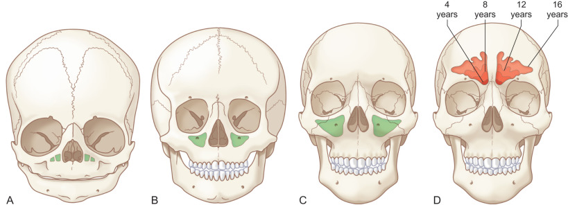Craniofacial development. Cranium to face ratio at birth (A) is 8 : 1 and evolves to 2.5 : 1 at adulthood (C). Maxillary sinus (green) progressive pneumatization at birth (A), at 5 years of age (B), and at adulthood (C). Frontal sinus (D) pneumatization.