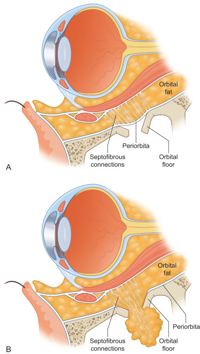 Schematic isolated orbital floor blow-out fracture. (A) Pediatric orbit with intact periosteum and ligamentous support. (B) Adult orbit with composite injury and periorbital herniation into fracture.