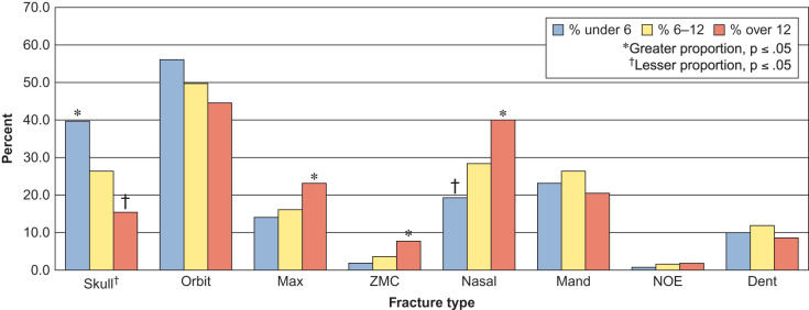 Percent incidence of facial fracture stratified by age ( max , maxillary; ZMC , zygomaticomaxillary; mand , mandible; NOE , naso-orbito-ethmoid; dent , dentoalveolar).