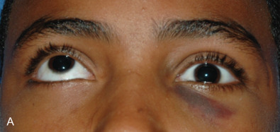 Subconjunctival hemorrhage in the setting of orbital trauma is always a sign of possible orbital fracture. However, the absence of this finding in the pediatric patient does not rule out a diagnosis of an entrapped orbital wall fracture. This presentation was termed “white-eyed blow-out” fracture by Jordan et al. in 1998. The conjunctiva may appear normal, but the entrapped periorbital tissue will result in severe gaze restriction. Radiographically, a fracture may not be significantly displaced, but periorbital tissue may often be identified in the adjacent sinus.