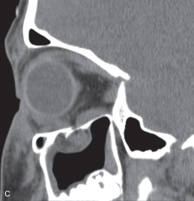 (A) Frontal view, left-sided isolated orbital floor trapdoor fracture with severe restriction of upward gaze. Computed tomography coronal view (B) and sagittal view (C) demonstrate entrapment of the inferior rectus muscle.