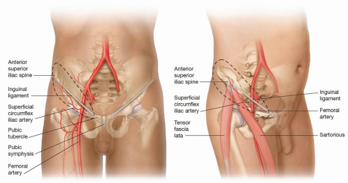 The superficial branch then pierces the fascia at the lateral border of the sartorius and runs 2 to 3 cm distal and parallel to the inguinal ligament, toward the anterior superior iliac spine (ASIS). This superficial branch supplies the skin to be used for the flap.