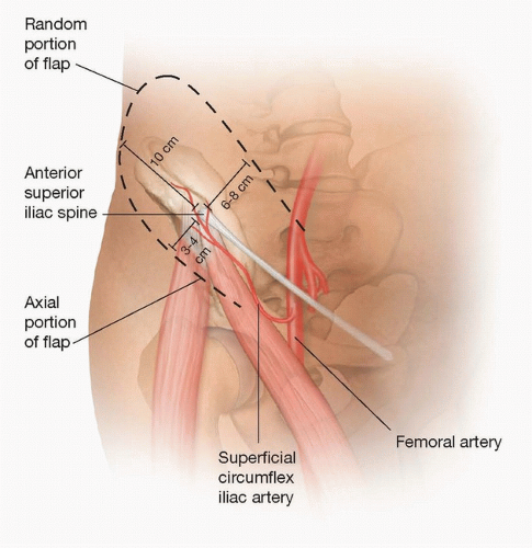 The lateral portion of the flap should be designed with a 1:1 length-to-width ratio. This is because the portion of the flap lateral to the ASIS has a random pattern of vascularization. Therefore, because the width of the flap is limited to 10 cm, the lateral limit of the flap is then 10 cm lateral to the ASIS.