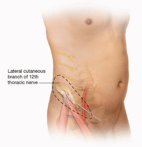 The 12th thoracic nerve pierces the internal and external oblique muscles and courses distally over the iliac crest, 5 cm posterior to the ASIS. Do not confuse the lateral femoral cutaneous nerve, which supplies sensation to the lateral thigh, for the 12th thoracic nerve.