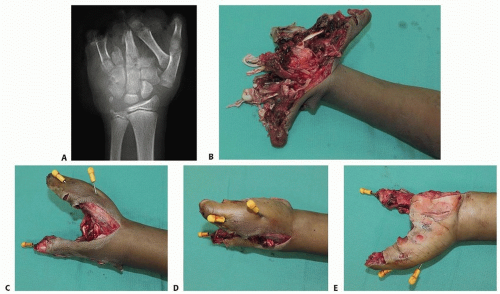 FIG 4 • A,B. Preoperative radiograph and clinical photograph, respectively, of a 12-year-old boy who sustained a bomb-blast injury to the left upper extremity. C-E. Images after left hand radical debridement, open reduction and internal fixation of the left thumb metacarpal using K-wires, and left index finger metacarpal transposition to the small finger and fixation with K-wires.