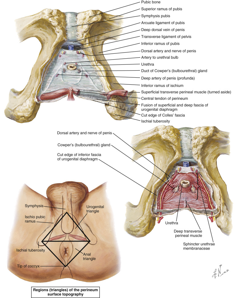 The perineum can be divided into an anterior, urogenital, and a posterior anal triangle by a transverse line connecting the ischial tuberosities ( Fig. 19.1 ). In the urogenital triangle we find the urogenital diaphragm, which spans between both pubic rami and is perforated by the urethra and vagina. It also serves as the insertion point for the musculature of the external genitalia (i.e., ischiocavernal and bulbospongiosal muscles). In the posterior lateral corner of the urogenital triangle, the neurovascular bundle enters the perineal region from the pudendal canal (Alcock canal). It consists of terminal branches of the pudendal nerve, the internal pudendal artery and vein. The pudendal nerve is split into the deep and superficial perineal nerve as well as the dorsal nerve of the penis/clitoris. The artery too splits into three branches: dorsal penile/clitoral artery, deep dorsal penile/clitoral artery, and bulbous artery. The venous drainage happens via the deep dorsal vein, the internal pudendal system, as well as the earlier mentioned superficial dorsal vein. The latter runs in the retropubic space and drains into the vesical plexus. Branches of the internal pudendal, obturator, and external pudendal vessels ensure the blood supply to the vulva and scrotum.